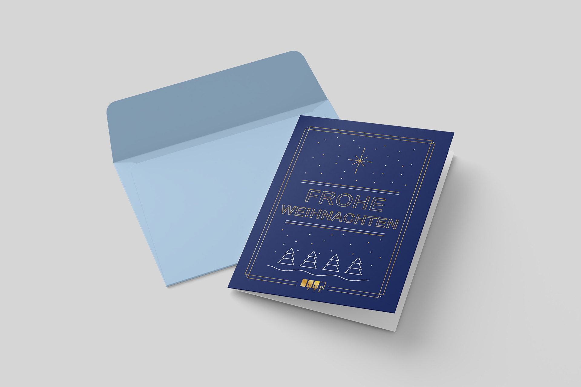 Weihnachtskarten mit Goldfolienveredelung aus den Jahren 2020–2024 für VVP in Lingen.